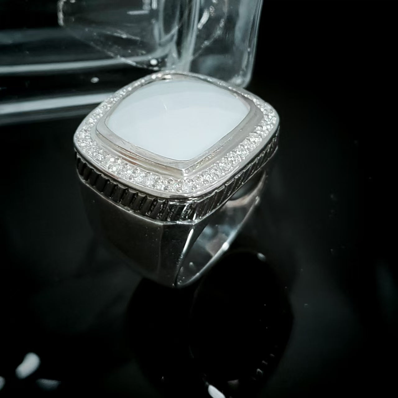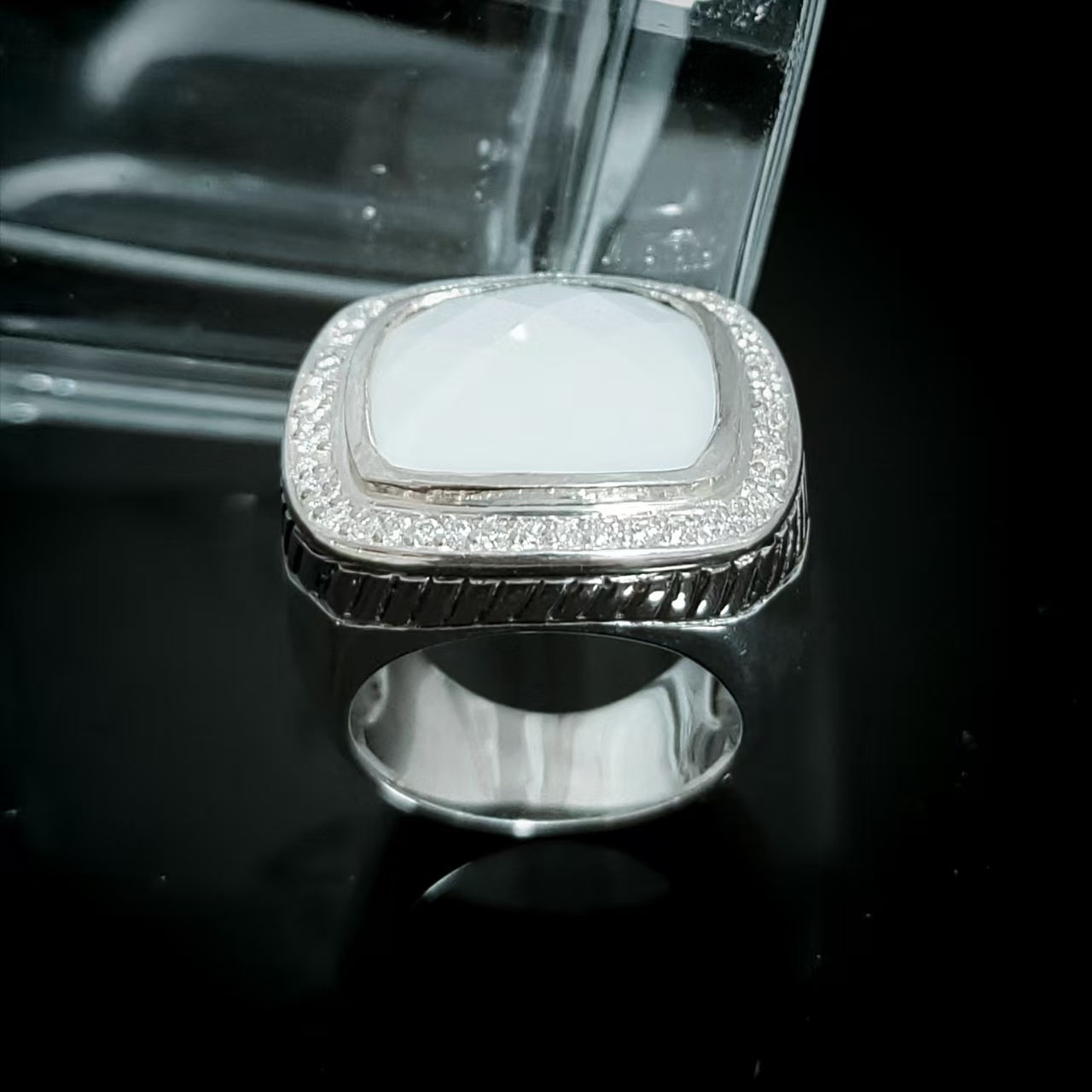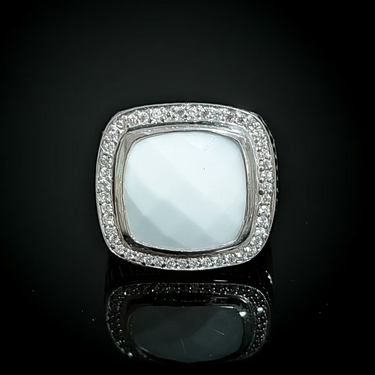 White Agate Natural Stone Cocktail Ring 925 Sterling Silver Pave CZ Statement Jewelry