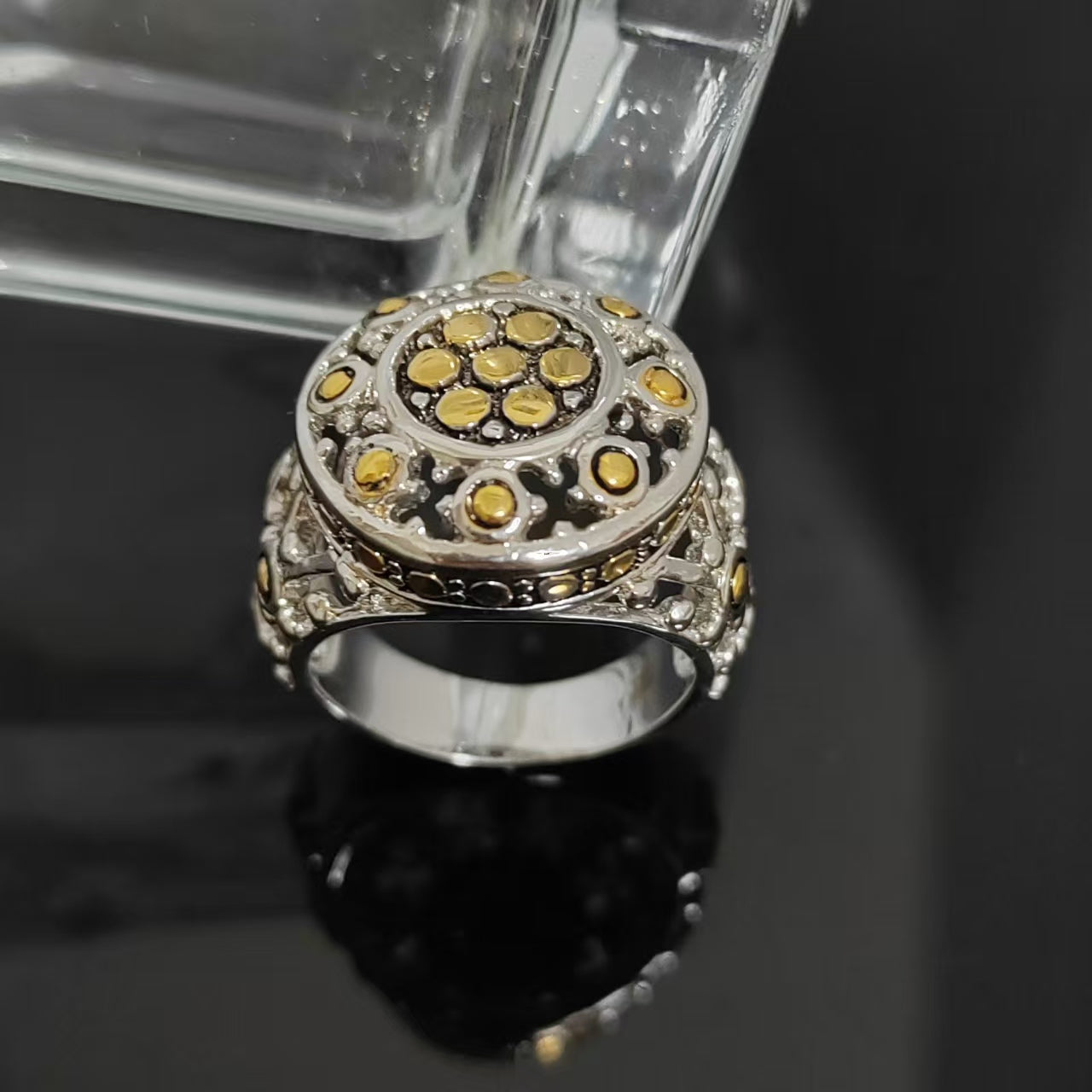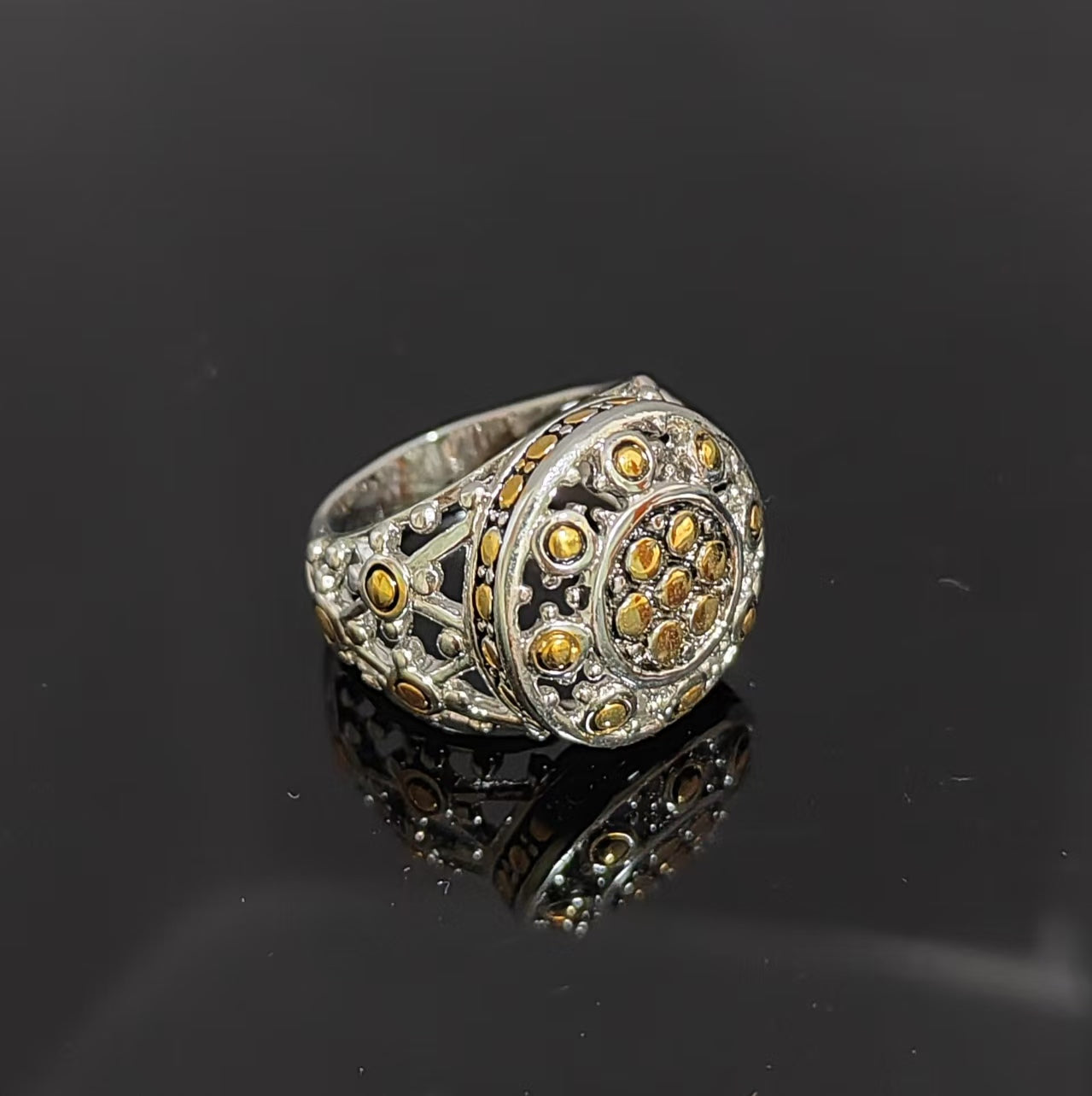 Round 925 Sterling Silver Gold Plated Dot Inlay Ring Size 7 Antique Jewelry